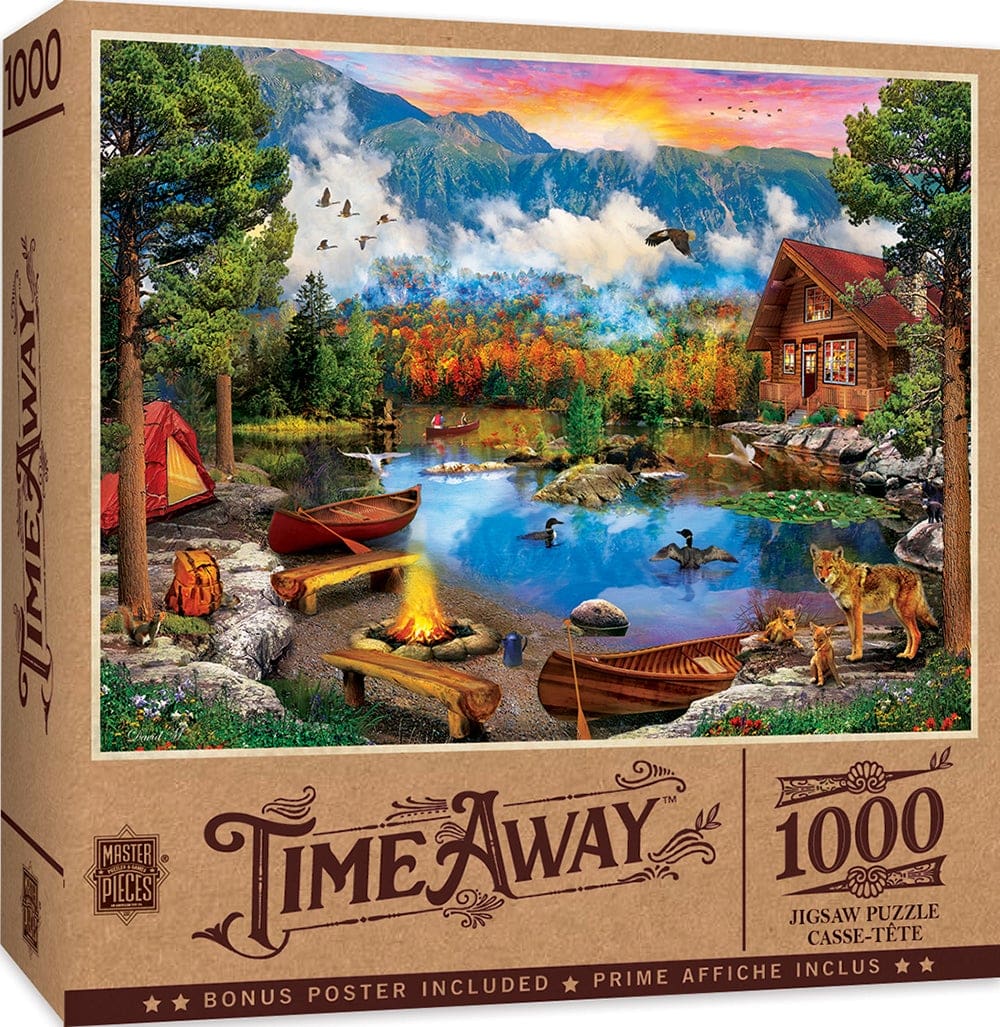 19.25″ x 26.75″ 1000pc Time Away Craft Paper Box Puzzle features an evening sunset at the campsite across the lake. Made of recycled material.