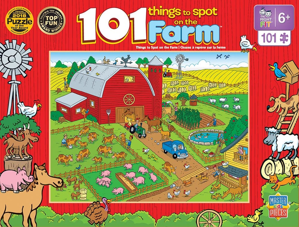 There are 101 things to spot on this farm, from horses to cows, and even the farmer’s missing hats. Can you find them all? Good luck! This puzzles is 101 pieces and 19 inches x 14 inches in size. Ages 6+.