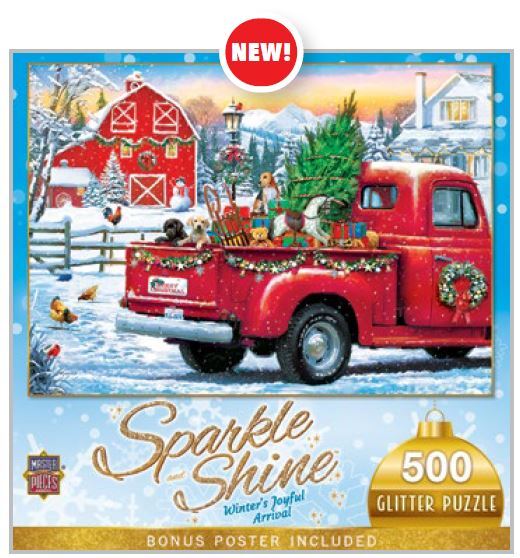 18×24″ glitter puzzle features a classic red truck filled with plenty of holiday décor items.Made of recyled material.