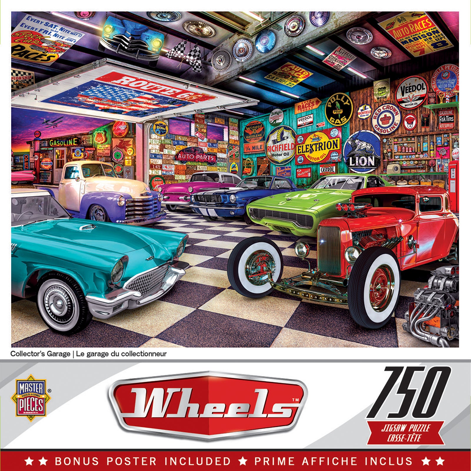 18″ x 24″ 750pc Wheels puzzles. The collector’s garage has everything from local license plates and gas signs to classic hot rods and muscle cars.Made of recycled materials