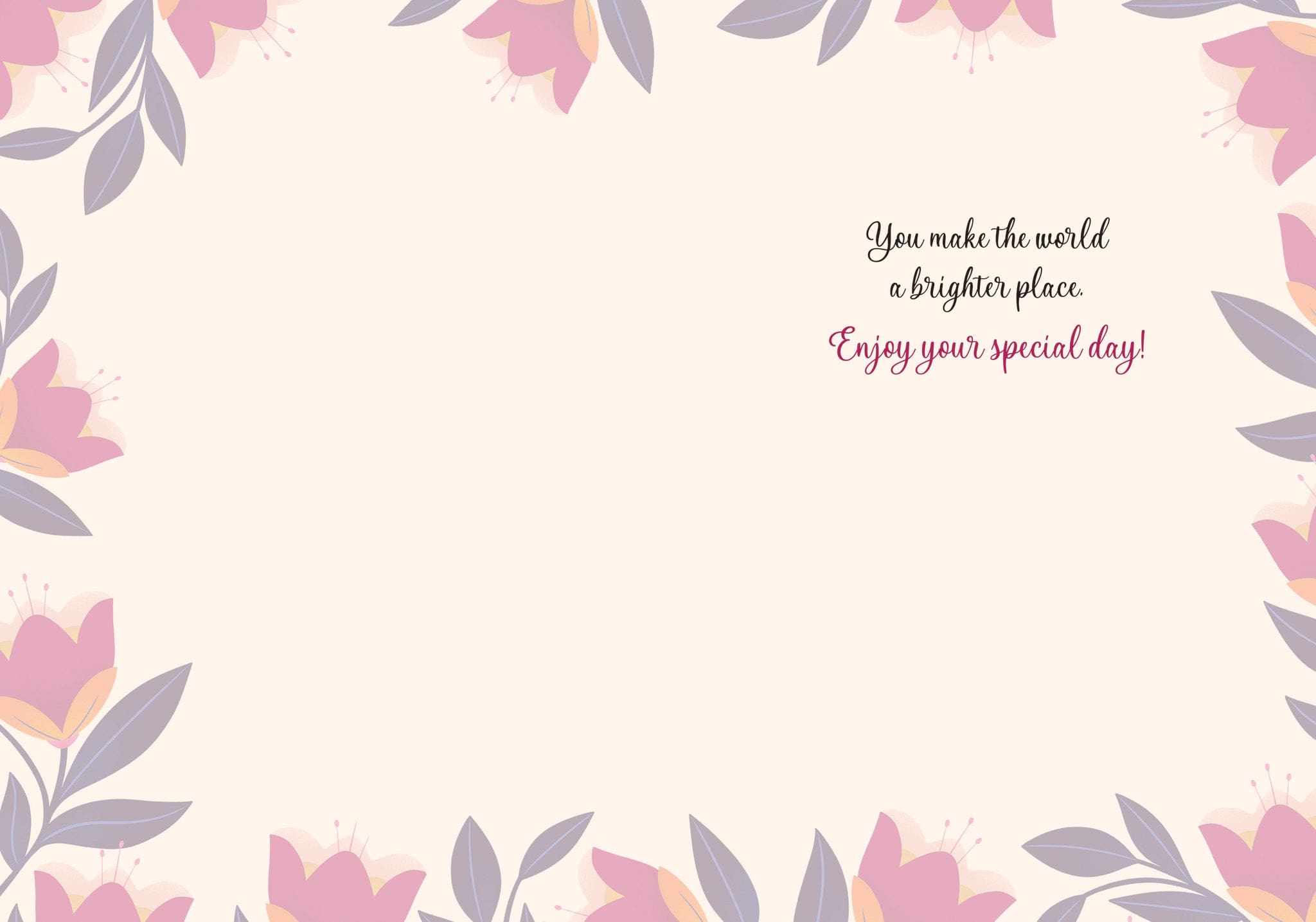 Each card measures 5″x7″ (13cmx18cm) and is printed in full colour on linen paper, comes with a coordinating colour envelope. Printed in Canada. Inside greeting: You make the world a brighter place. Enjoy your special day.