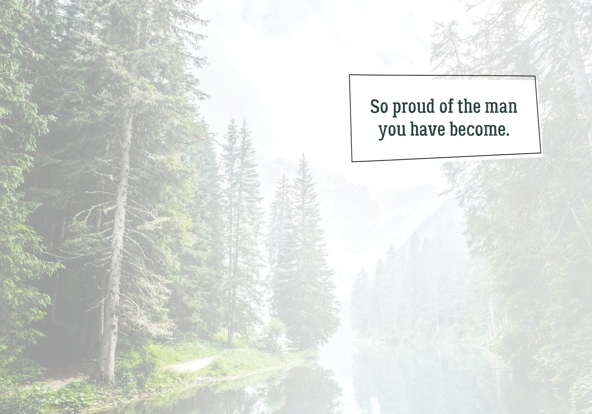 Each card measures 5″x7″ (13cmx18cm) and is printed in full colour on linen paper, comes with a coordinating colour envelope. Printed in Canada. Inside greeting: So proud of the man you have become.