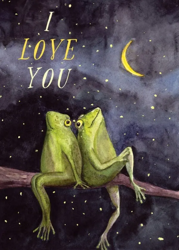 4.5″x6.25″, printed on linen paper, with coordinating envelope. Printed in Canada. Inside greeting: To the moon and back!
