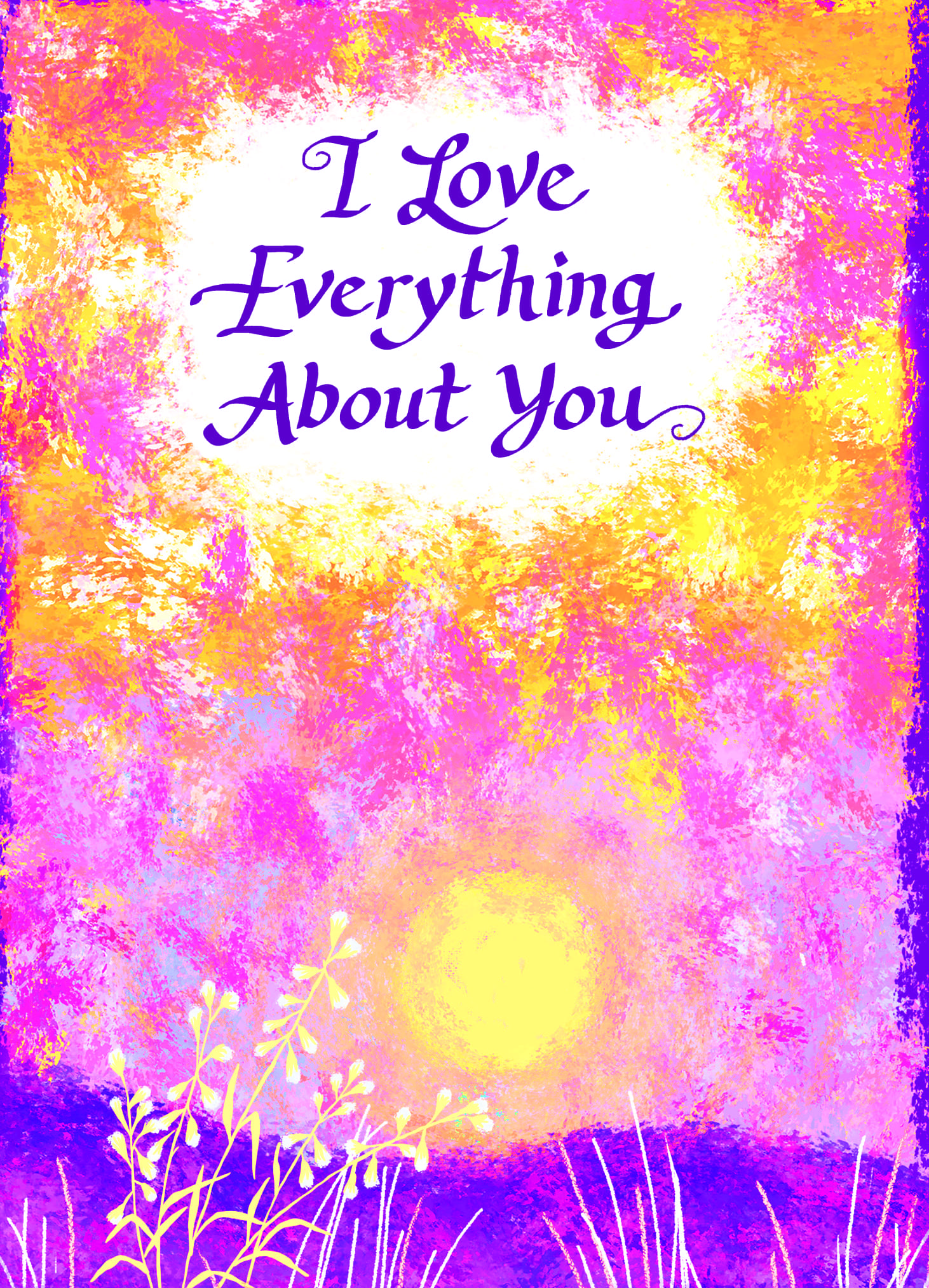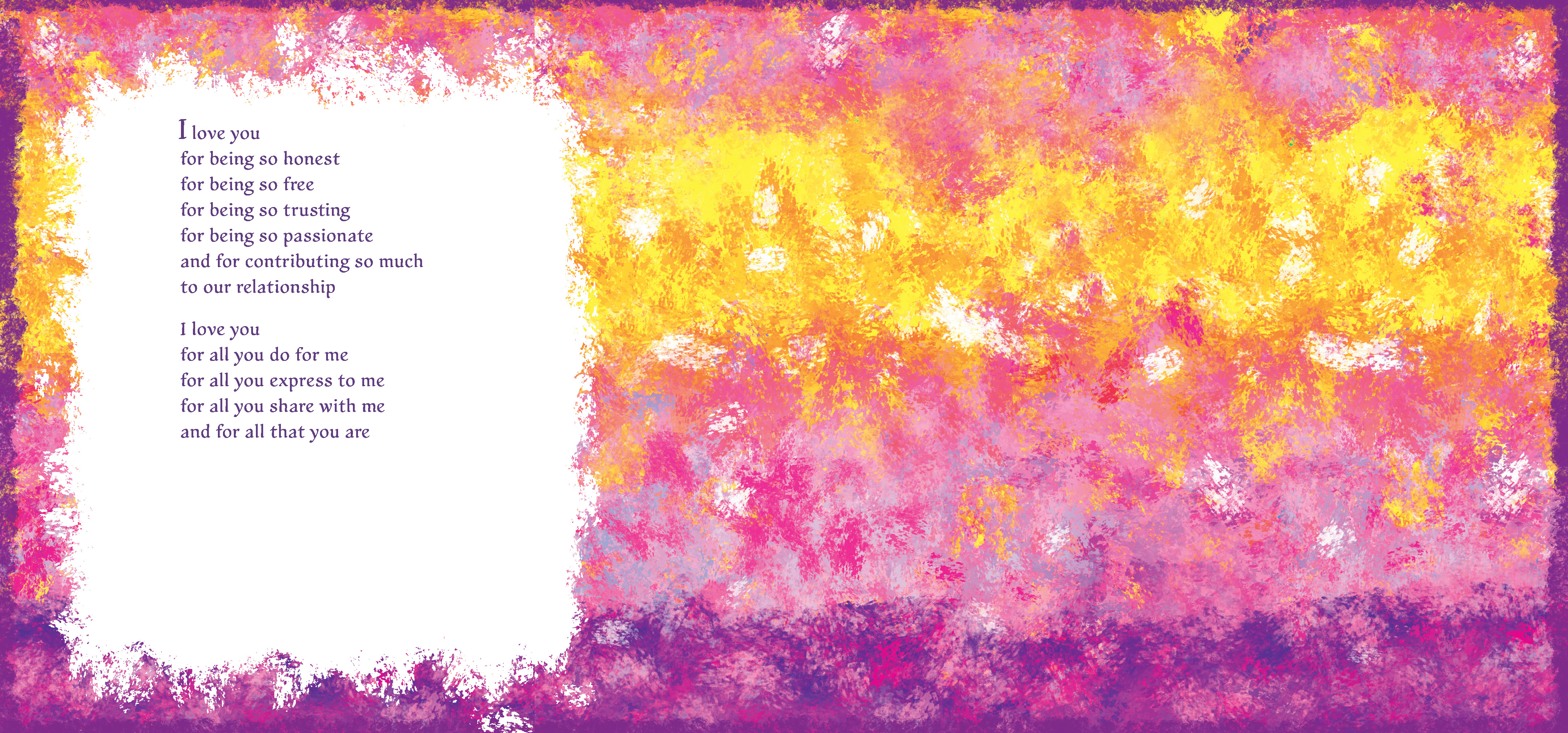 Trifold Card Size: 5 x7 inches Inside: I love you for being honet for being so free for being so trusting for being so passionate and for contirubuting so much to our relationship.