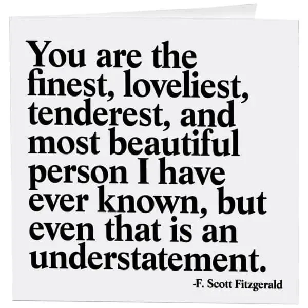 5″ square greeting card. Printed in the USA on recycled paper. Inside: you are the finest, loveliest, tenderest, and most beautiful person i have ever known, but even that is an understatement.