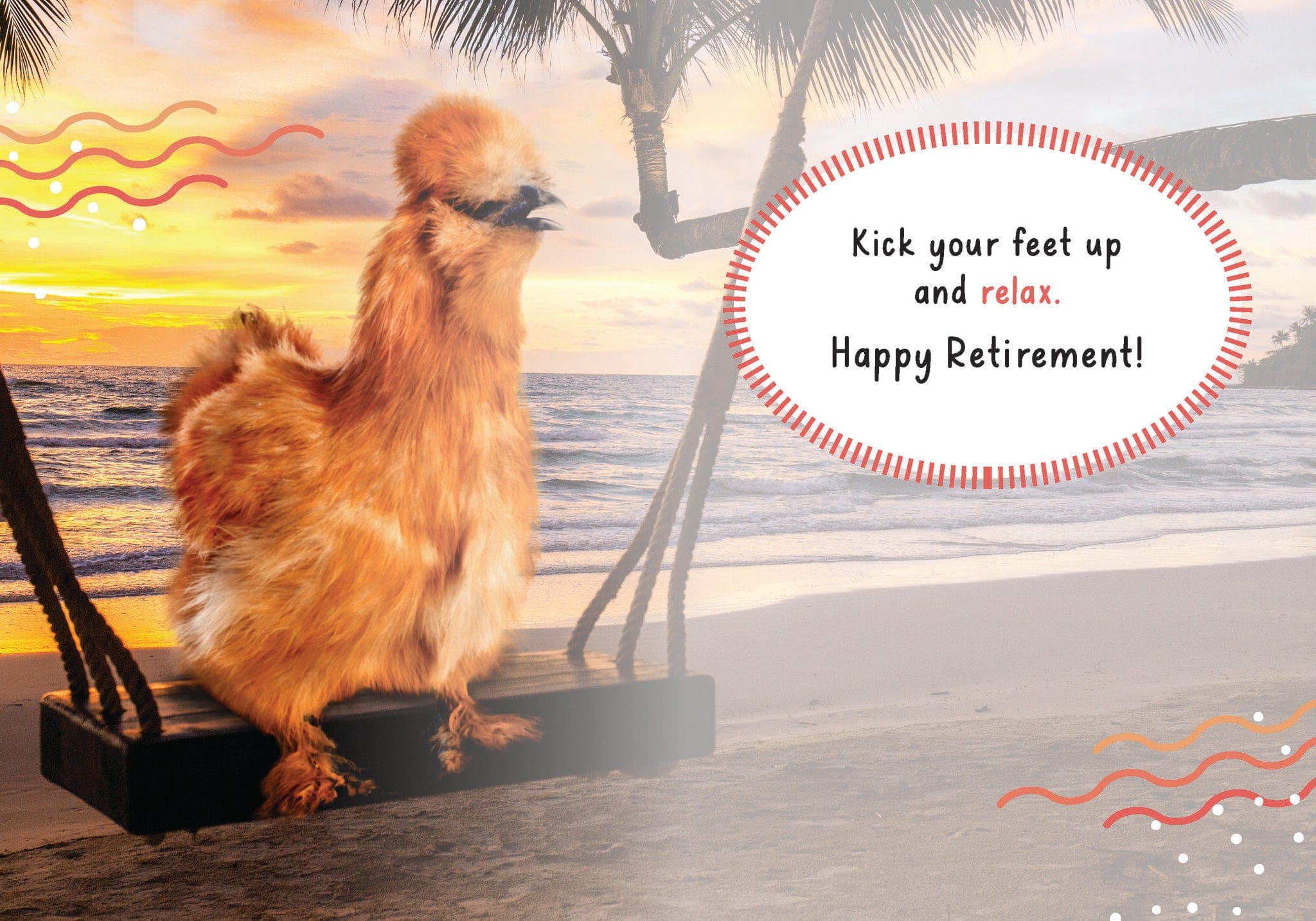 Each card measures 5″x7″ (13cmx18cm) and is printed in full colour on coated paper, comes with a coordinating colour envelope. Printed in Canada. Inside greeting: Kick your feet up and relax. Happy Retirement