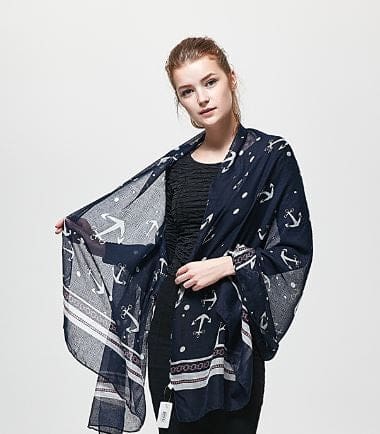 Dark navy shawl/scarf with anchors is versatile with various outfits, perfect for everyday use. 100% Viscose. Dimensions: 70″ x 32″ HAND WASH OR DRY CLEAN ONLY.