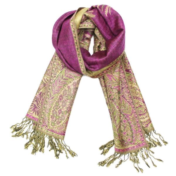 Reversible, border pattern pashmina scarf/ wrap, would make an wonderful accessory for all occasions. 50% Viscose 50% Acrylic. Dimensions: 27″ x 70″ with soft fringes. HAND WASH OR DRY CLEAN ONLY.