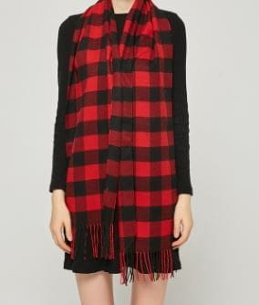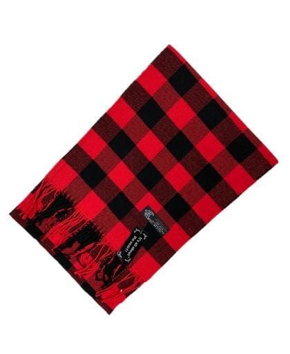 Red and Black Buffalo Plaid cashmere feel scarf. 100% Acrylic. Dimensions: 12″ x 72″ with soft fringe. HAND WASH OR DRY CLEAN ONLY.