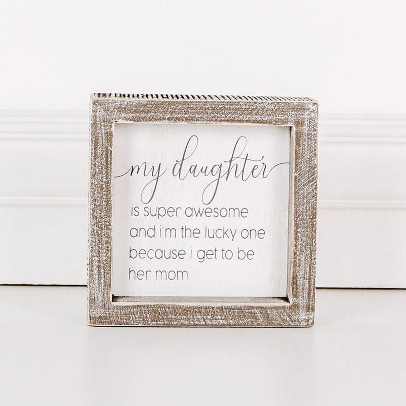 Displaying a heart-warming message,”My Daughter Is Super Awesome And I’m The Lucky One Because I Get To Be Her Mom”). Measures 5″x 5″x 1.5″ and looks great either hanging or freestanding. Gray/White.