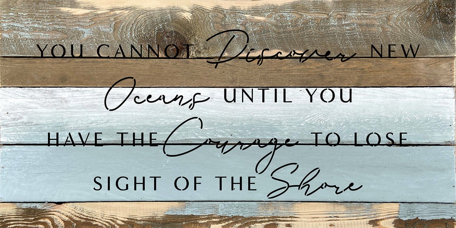 You cannot discover new oceans until you have the courage to lose sight of the shore 24×12 Blue Whisper Reclaimed Wood Wall Décor