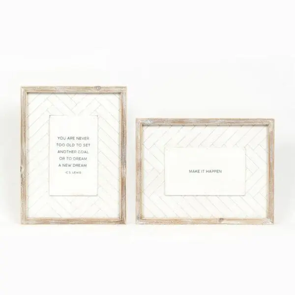 13″x 17″x 1.5 reversible wood framed herringbone sig, white/black. Double sided and features two different quotes. Change your look with just a flip.