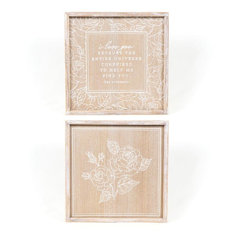 14″x 14″x 1.5″ reversible wood framed sign (I LOVE YOU BECAUSE THE ENTIRE UNIVERSE CONSPIRED TO HELP ME FIND YOU) natural/white