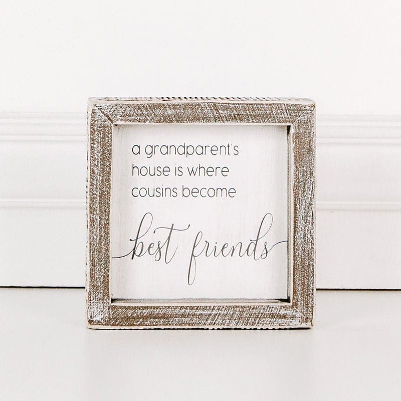 Displaying an inspiring message saying, “A Grandparent’s House Is Where Cousins Become Best Friends”, this framed sign adds a positive vibe in your granny’s home. It measures 5″x 5″x 1.5″ and looks great hanging or freestanding. Gray/White.