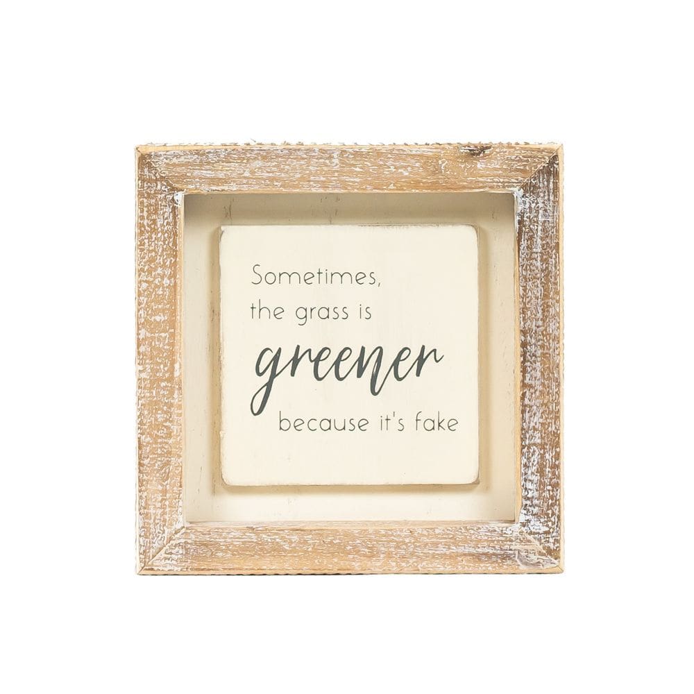 Enhance your decor with this witty and charming 5x5x1.5″ Wood Frame Sign, featuring the playful phrase “Sometimes, the grass is greener because it’s fake” in a stylish white and grey color scheme.