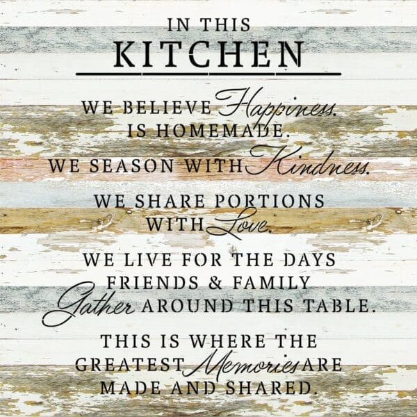In this kitchen, We believe happiness is homemade. We season with kindness. We share portions with love.. 28×28 White Reclaimed Wood Wall Décor