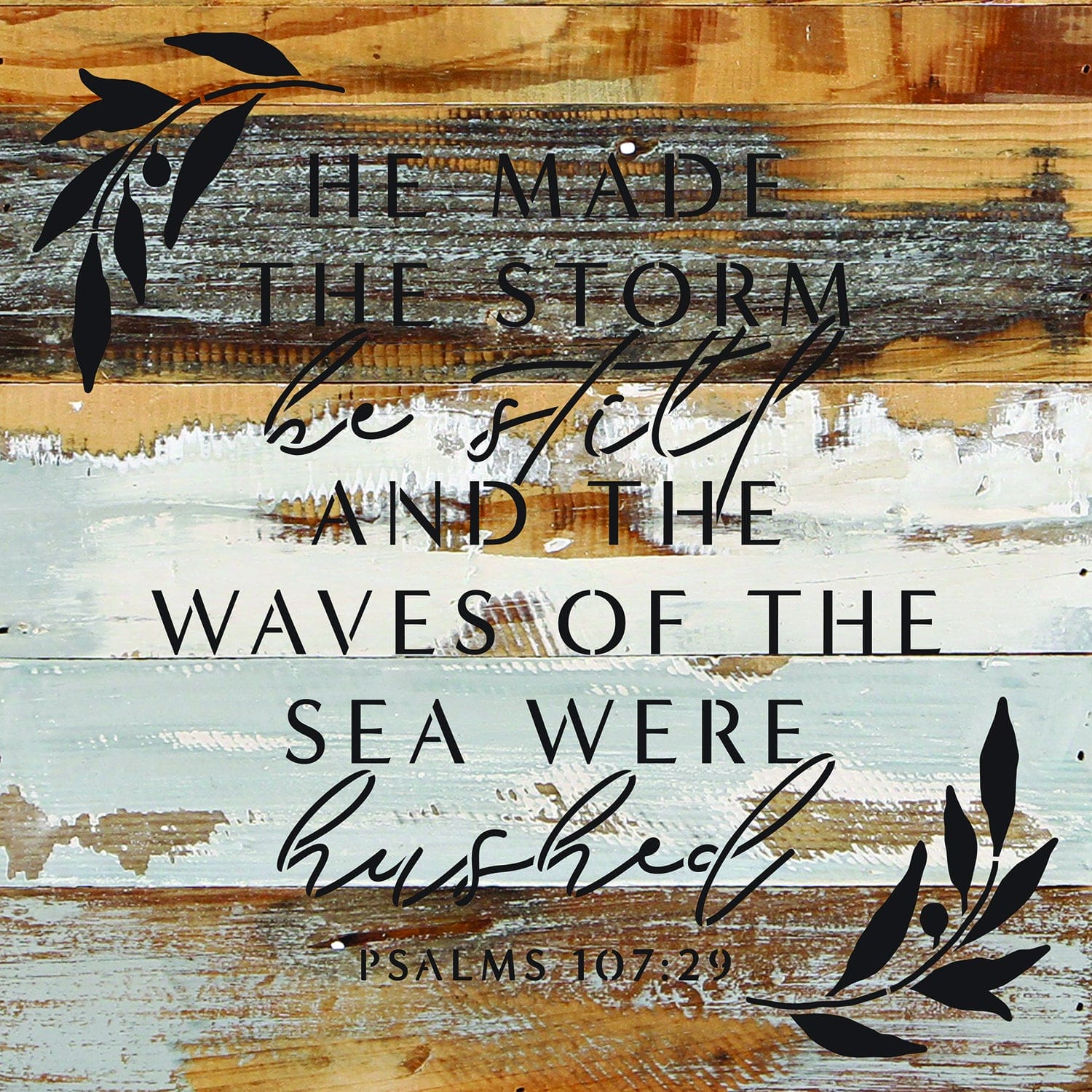 He made the storm be still and the waves of the sea were hushed 14×14 Blue Whisper Reclaimed Wood Wall Décor