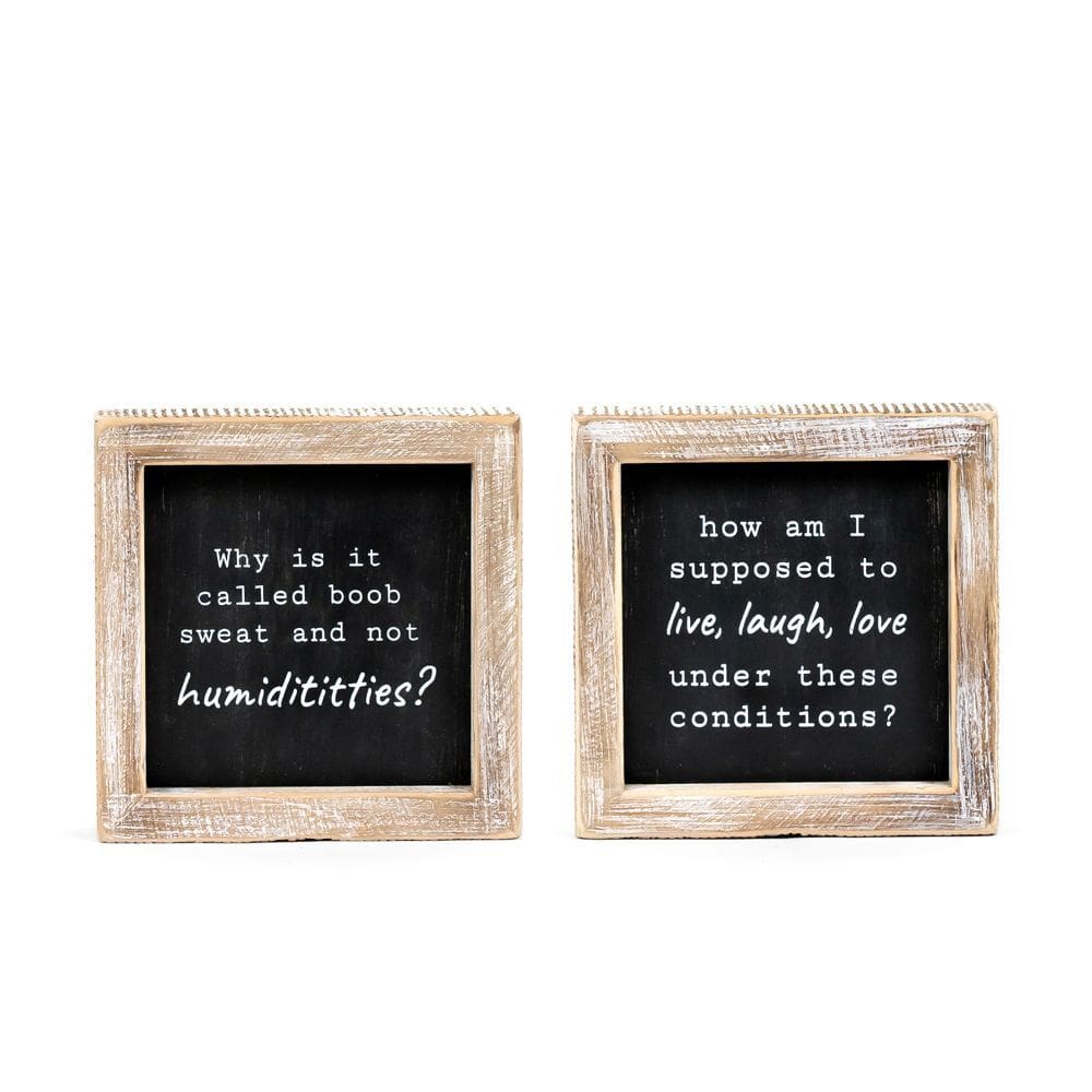 5″x 5″x 1.5″ reversible wood framed sign (“How am I supposed to Live, Laugh, Love under these conditions? / “Why is it called boob sweat and not humidititties?”) black/white.