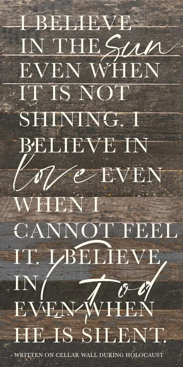 I believe in the sun even when it is not shining. I believe in love even when I cannot see it. I believe in God when in he is silent 12×24 Espresso Reclaimed Wood Wall Décor Sign