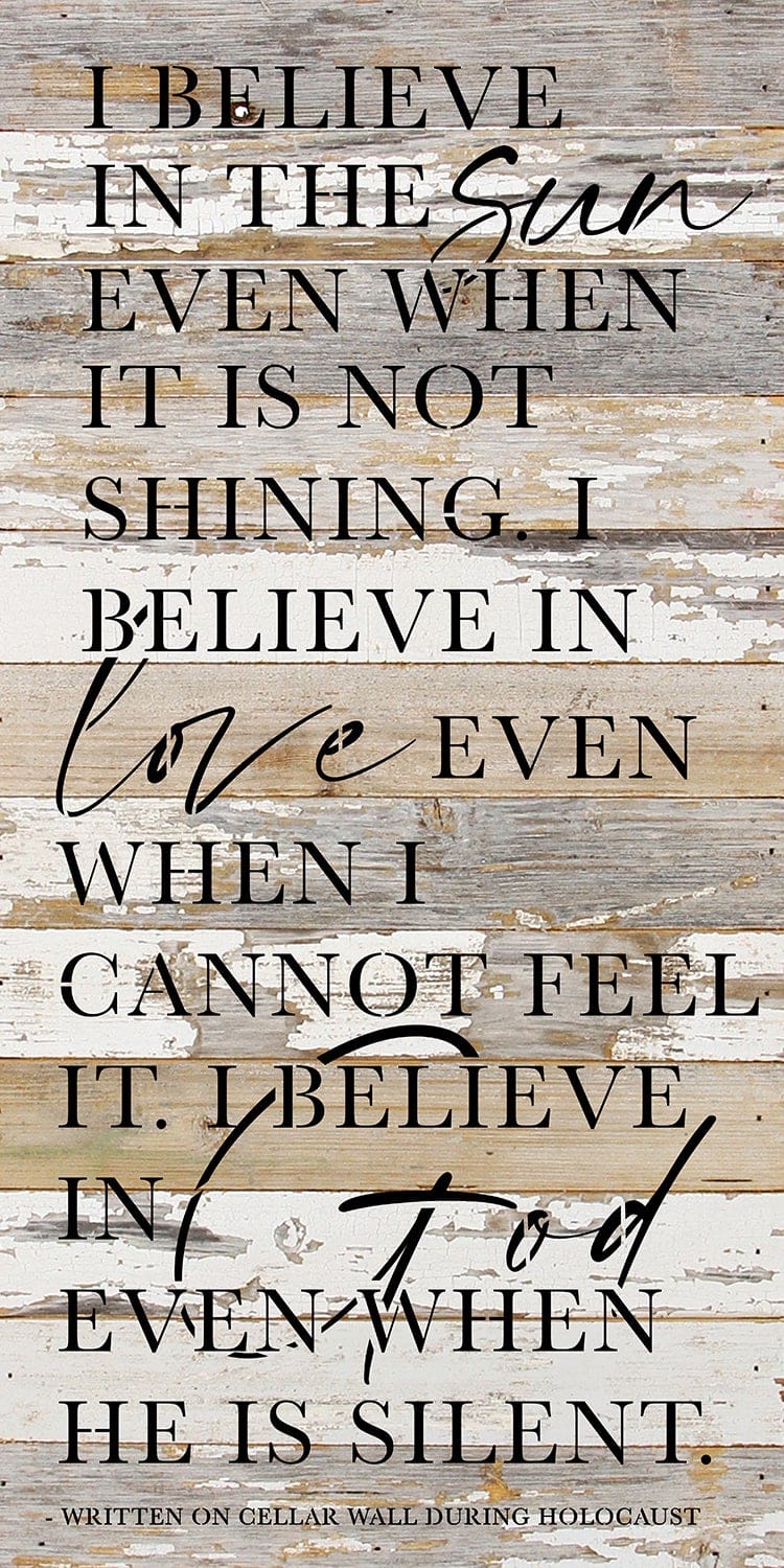 I believe in the sun even when it is not shining. I believe in love even when I cannot see it. I believe in God when in he is silent 12×24 White Reclaimed Wood Wall Décor Sign