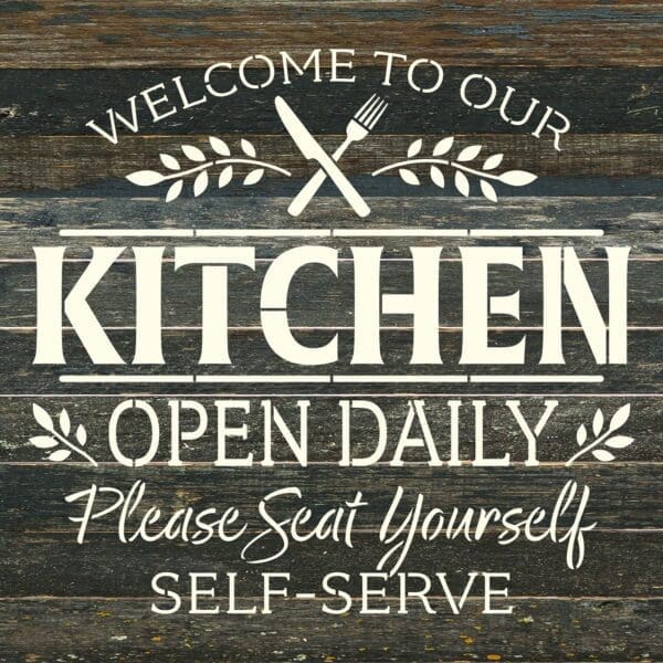 Welcome to our Kitchen Open Daily. Please seat yourself. Self-Serve 14×14 Espresso Reclaimed Wood Wall Décor