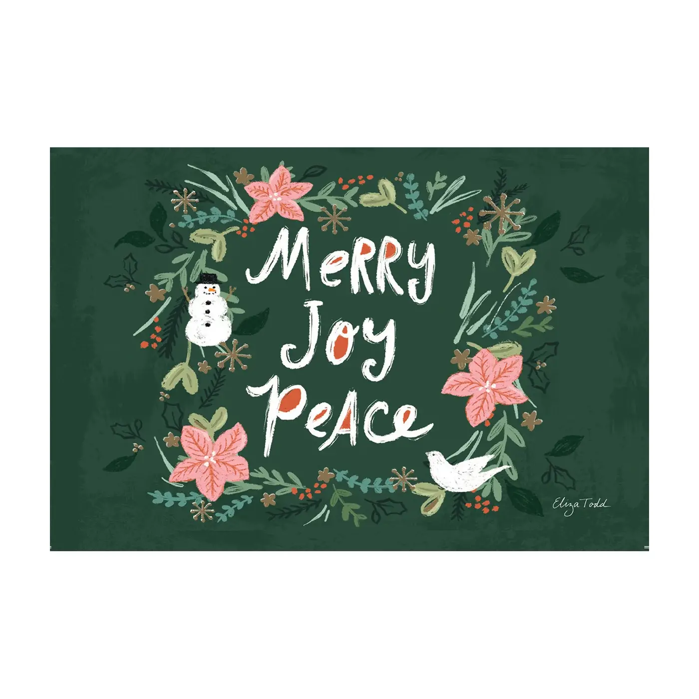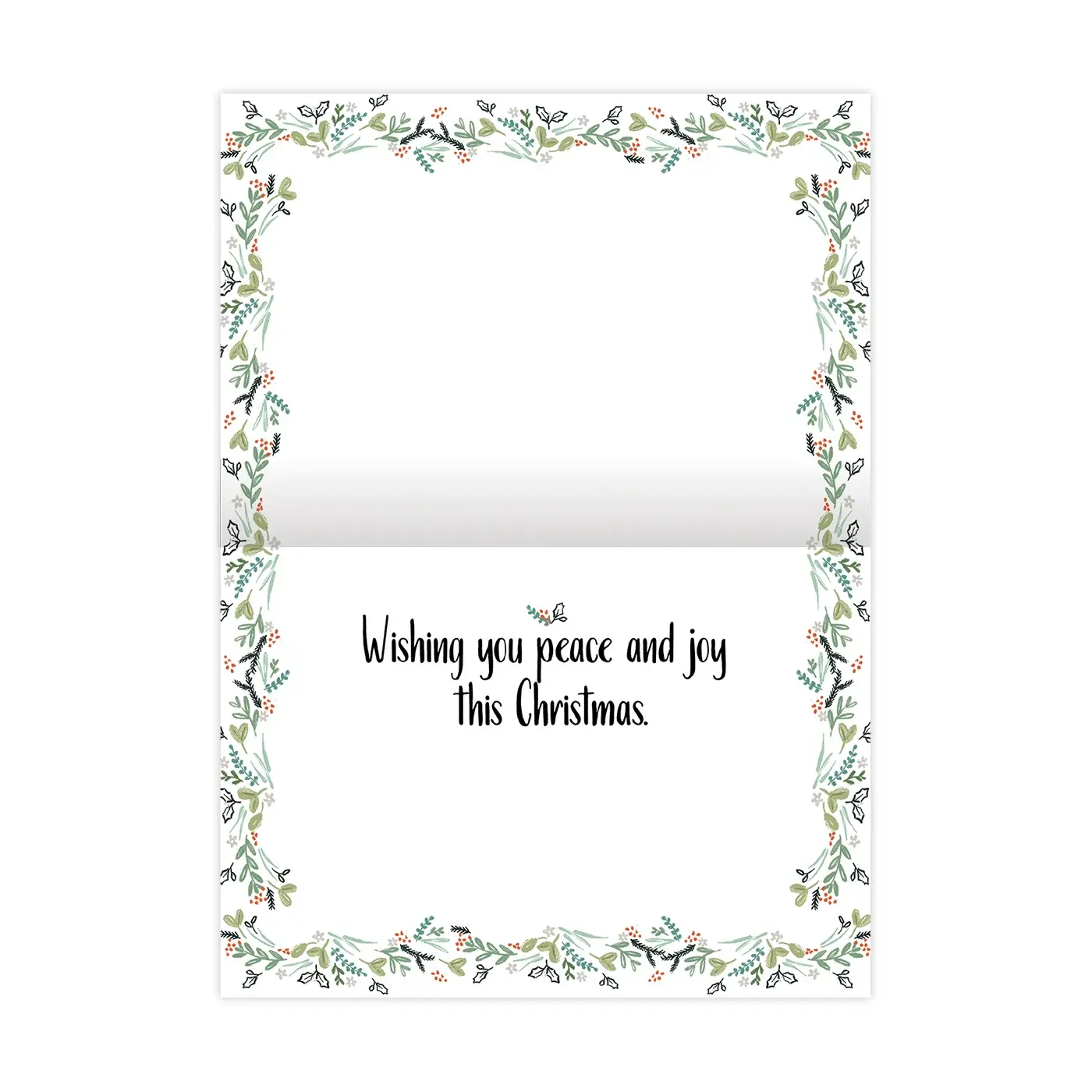 12 cards and 13 envelopes in a coordinating box with acetate lid. Linen-embossed paper stock. Card: 5″w x 3.5″h. Inside text: Wishing you peace and joy this Christmas.