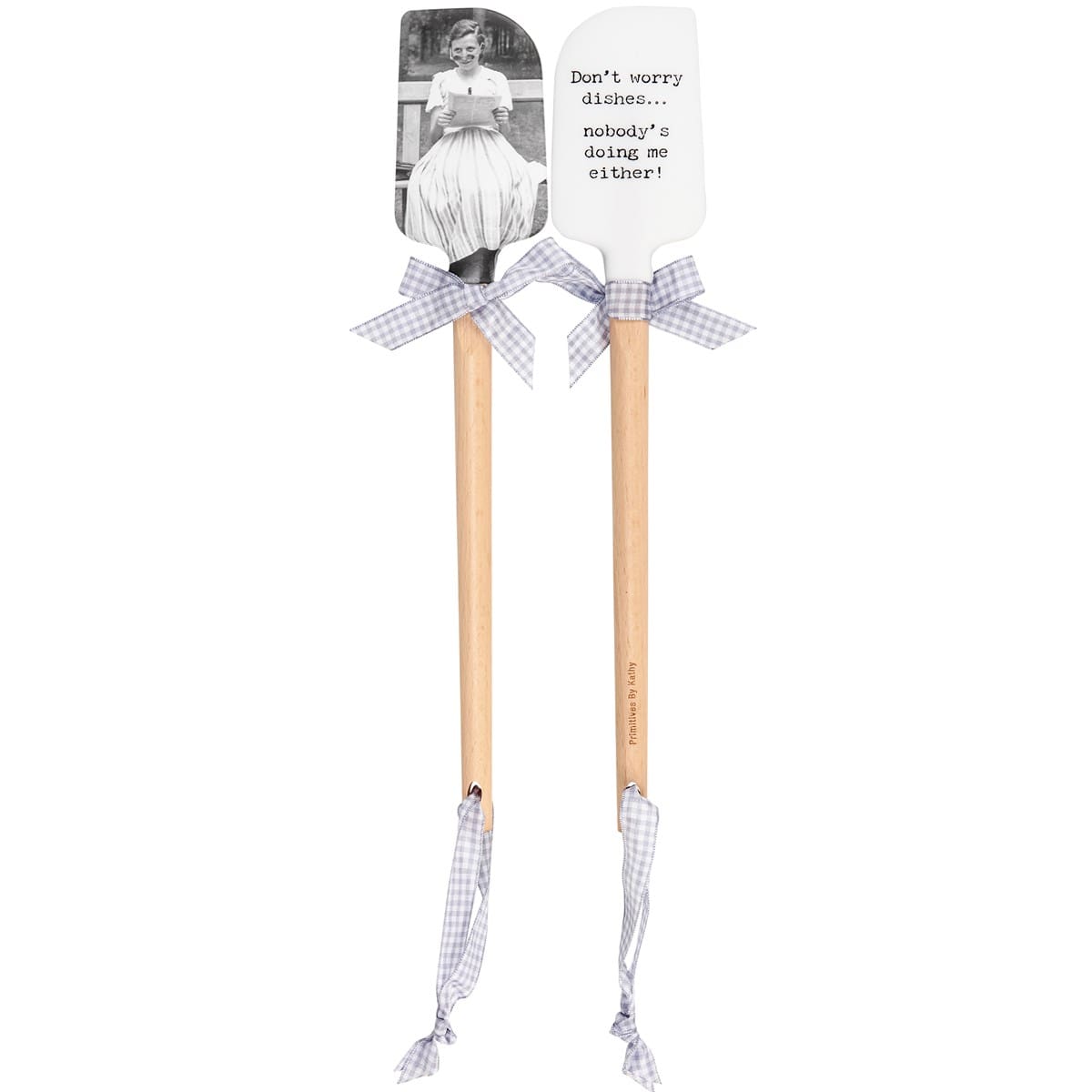 Double-sided silicone spatula features a vintage photograph and hilarious. Includes a logo-engraved durable wooden handle complete with gray and white gingham bow and ribbon for hanging. Measures 2.5″x13″. Hand-wash only. Do not microwave.