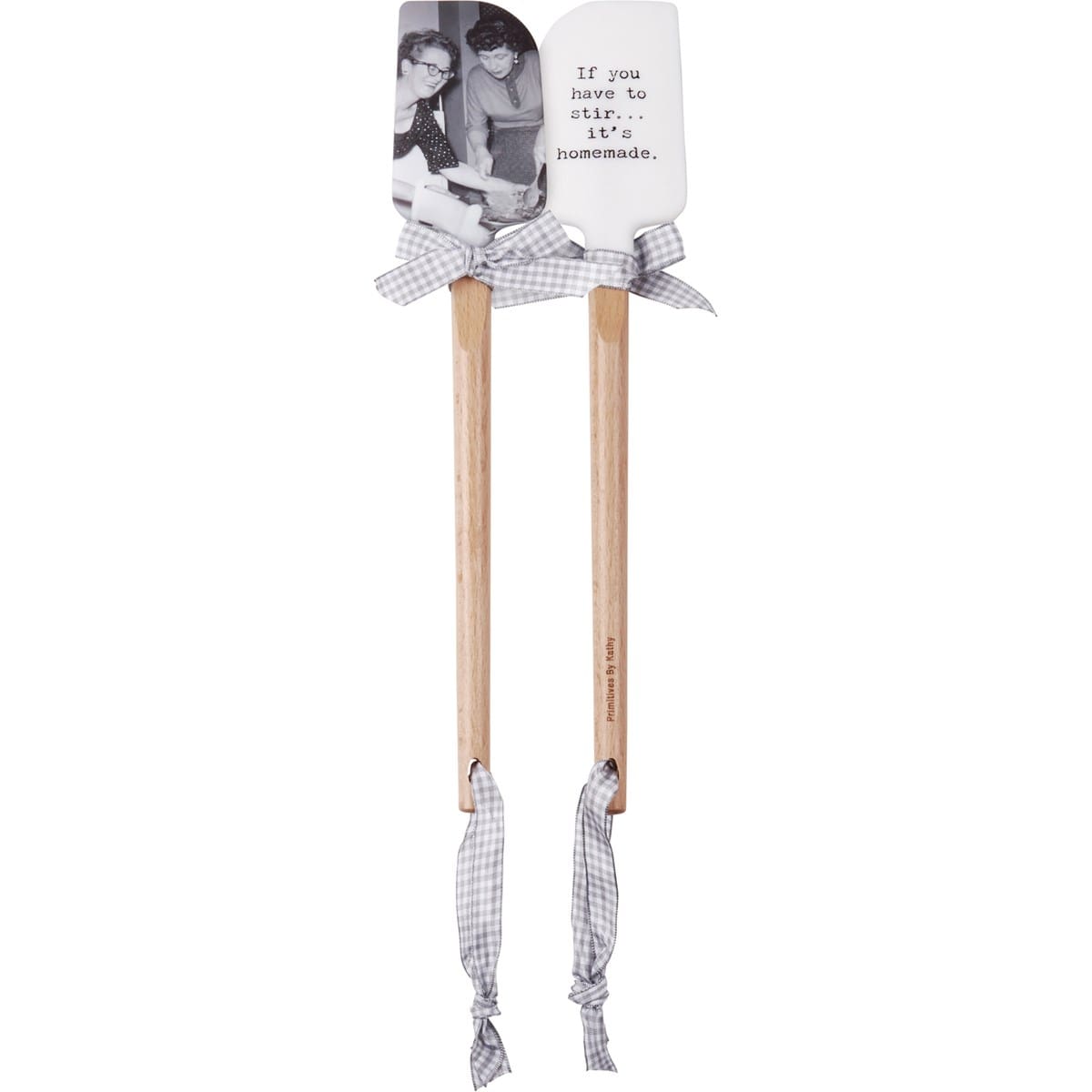 Double-sided silicone spatula features a vintage photograph and hilarious. Includes a logo-engraved durable wooden handle complete with gray and white gingham bow and ribbon for hanging. Measures 2.5″x13″. Hand-wash only. Do not microwave.