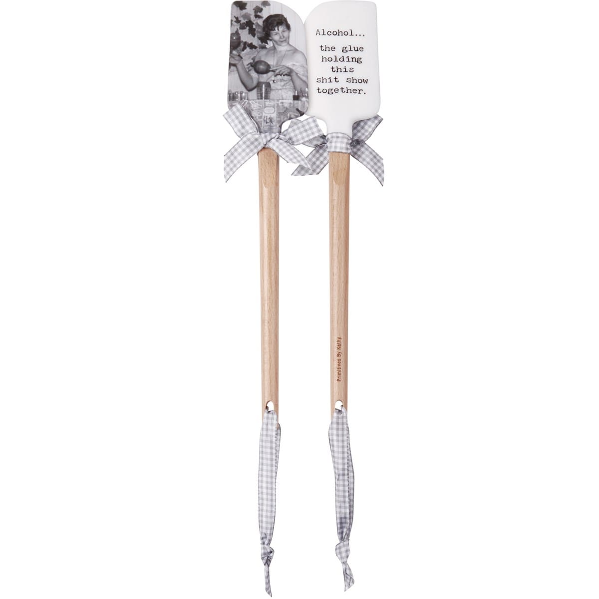 Double-sided silicone spatula features a vintage photograph and hilarious. Includes a logo-engraved durable wooden handle complete with gray and white gingham bow and ribbon for hanging. Measures 2.5″x13″. Hand-wash only. Do not microwave.