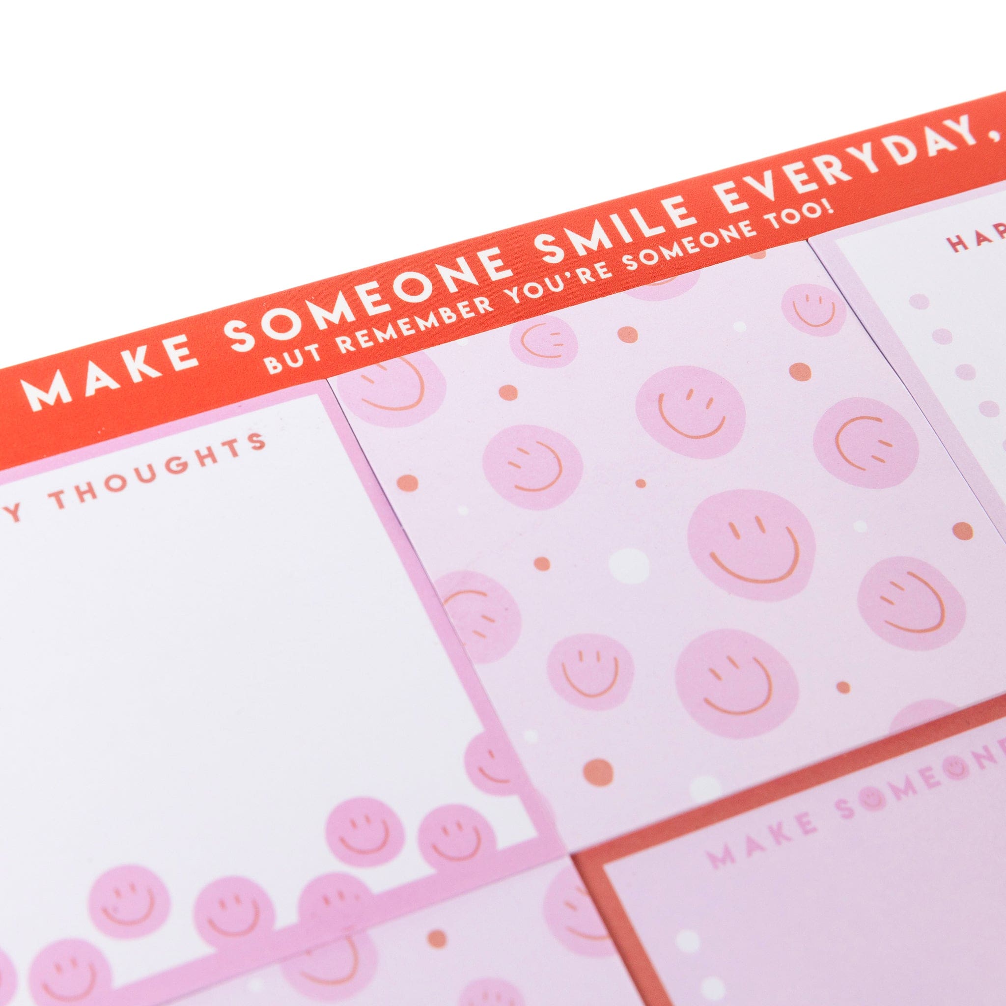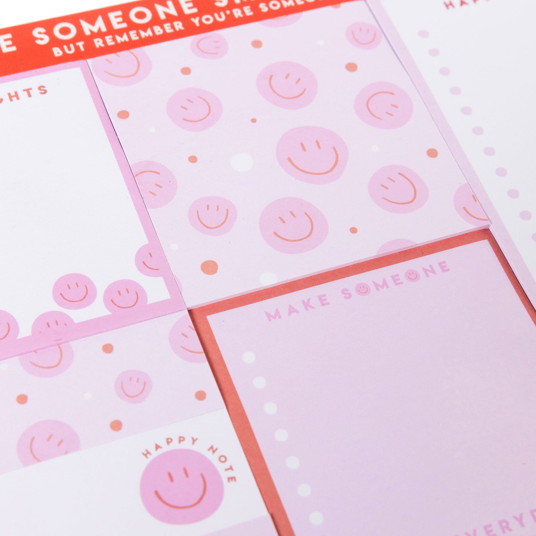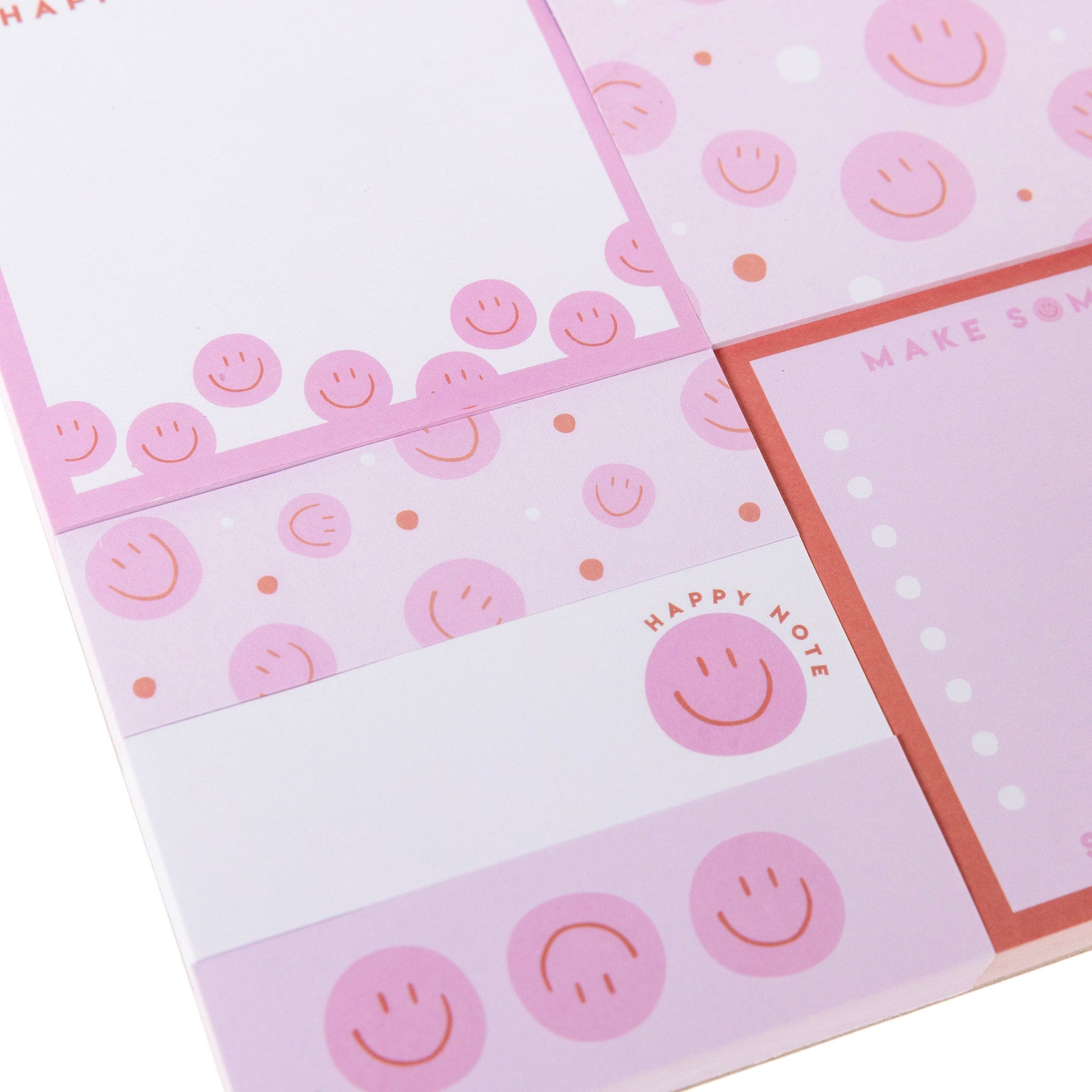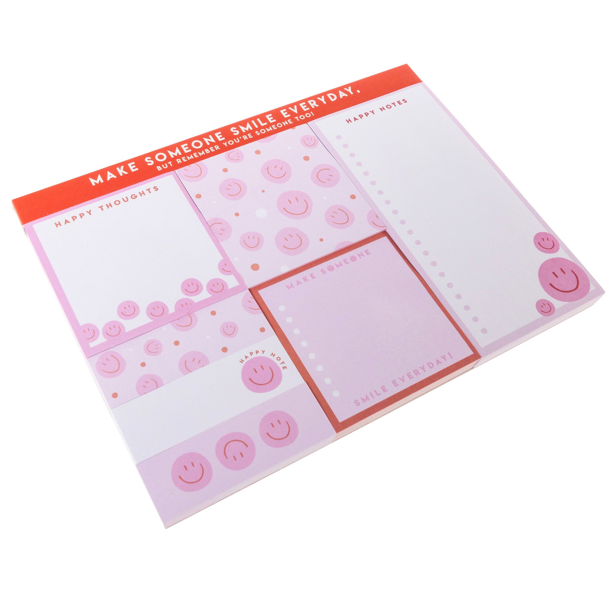 Sticky Note set includes 7 sticky pads of varying sizes with 80 sheets in each pad. Large pad: 2.75″ x 5.5″, Medium pad: 2.75″ x 2.75″, Small pad: 2.75″ x 1″.