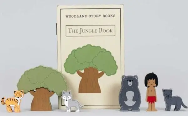 Set of 6 wood Jungle Book-themed shapes. Great for kids imagination and play. Each piece fits snugly inside the book for effortless storage. Book measures 8×13