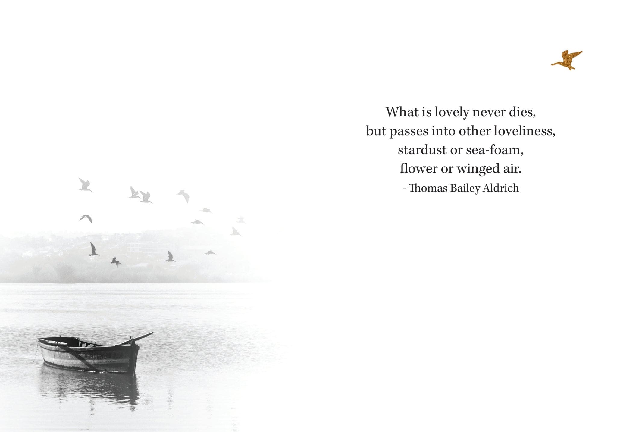 Measures 5″x7″ is printed in full colour on linen paper comes with a coordinating colour env. Printed in Canada. Inside: What is lovely never dies, but passes into other loveliness, stardust or sea-foam, flower or winged air. -Thomas Bailey Aldrich