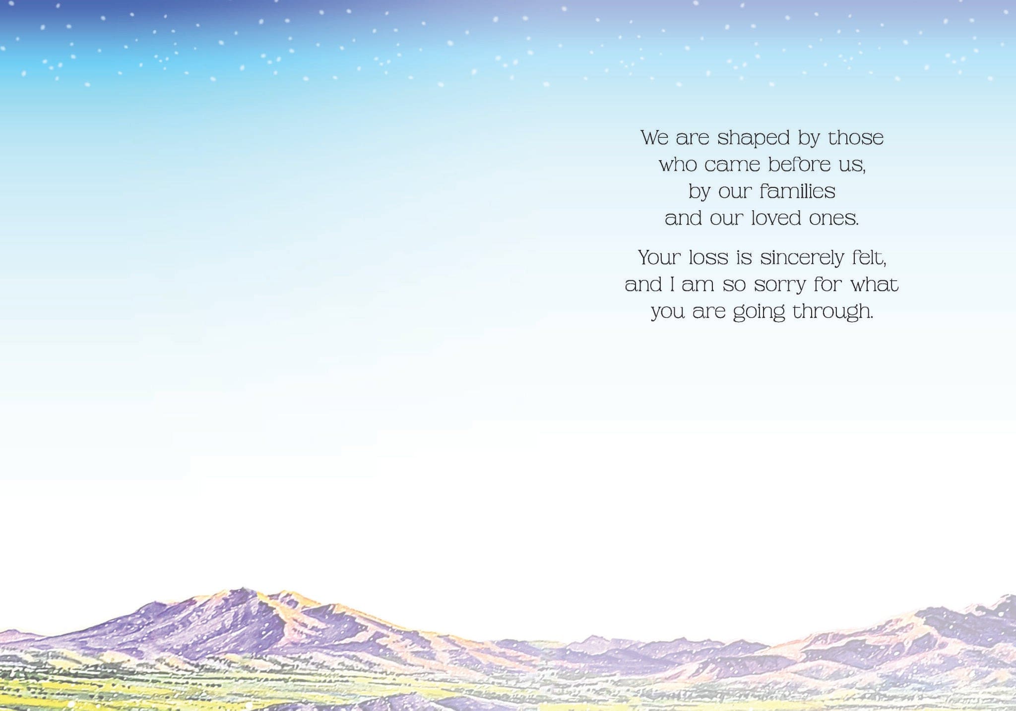 5″x7″ printed in full col on linen paper with a coordinat. envelope. Printed in CAN. Inside: We are shaped by those who came before us by our families and our loved ones. Your loss is sincerely felt, and I am so sorry for what you are going through.