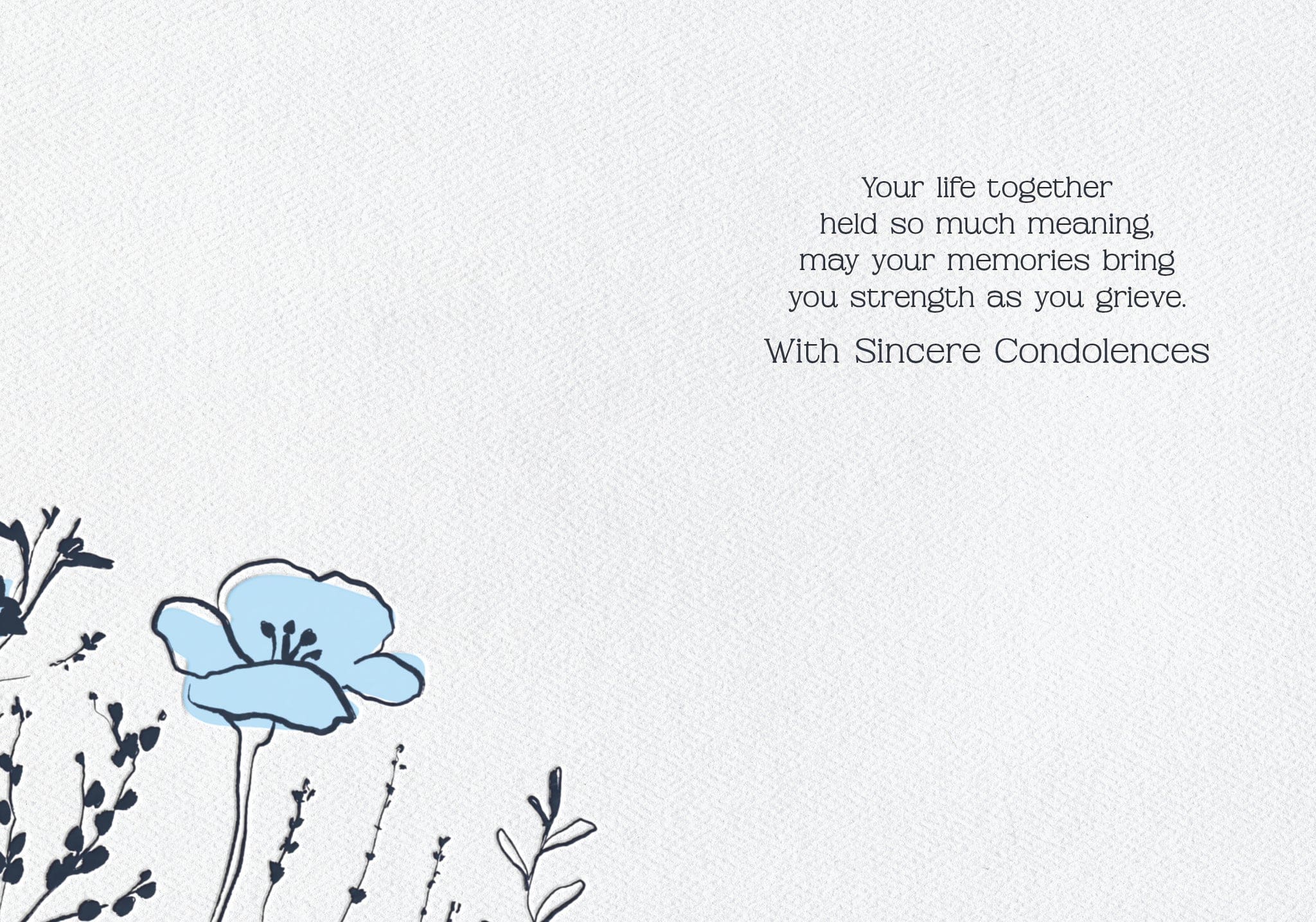 Each card measures 5″x7″, printed in full colour on linen paper, w/coordinating col. envelope. Printed in Canada. Inside greeting: Your life together held so much meaning, may your memories bring you strength as you grieve. With Sincere Condolences