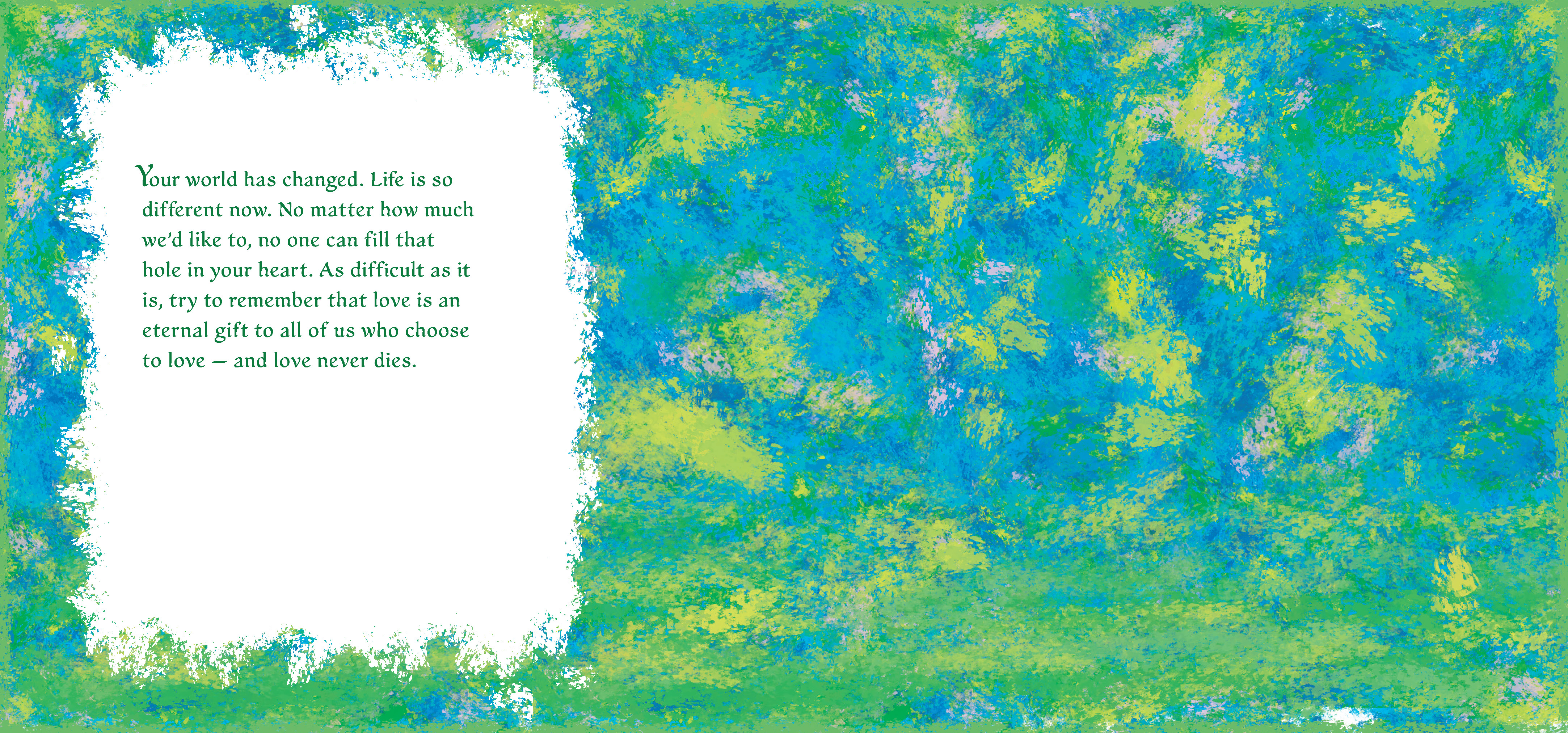 Trifold Card Size: 5 x7 inches Inside: Your world has changed, Life is so different now. No matter how much we’d like to, no one can fill that hole in your heart.