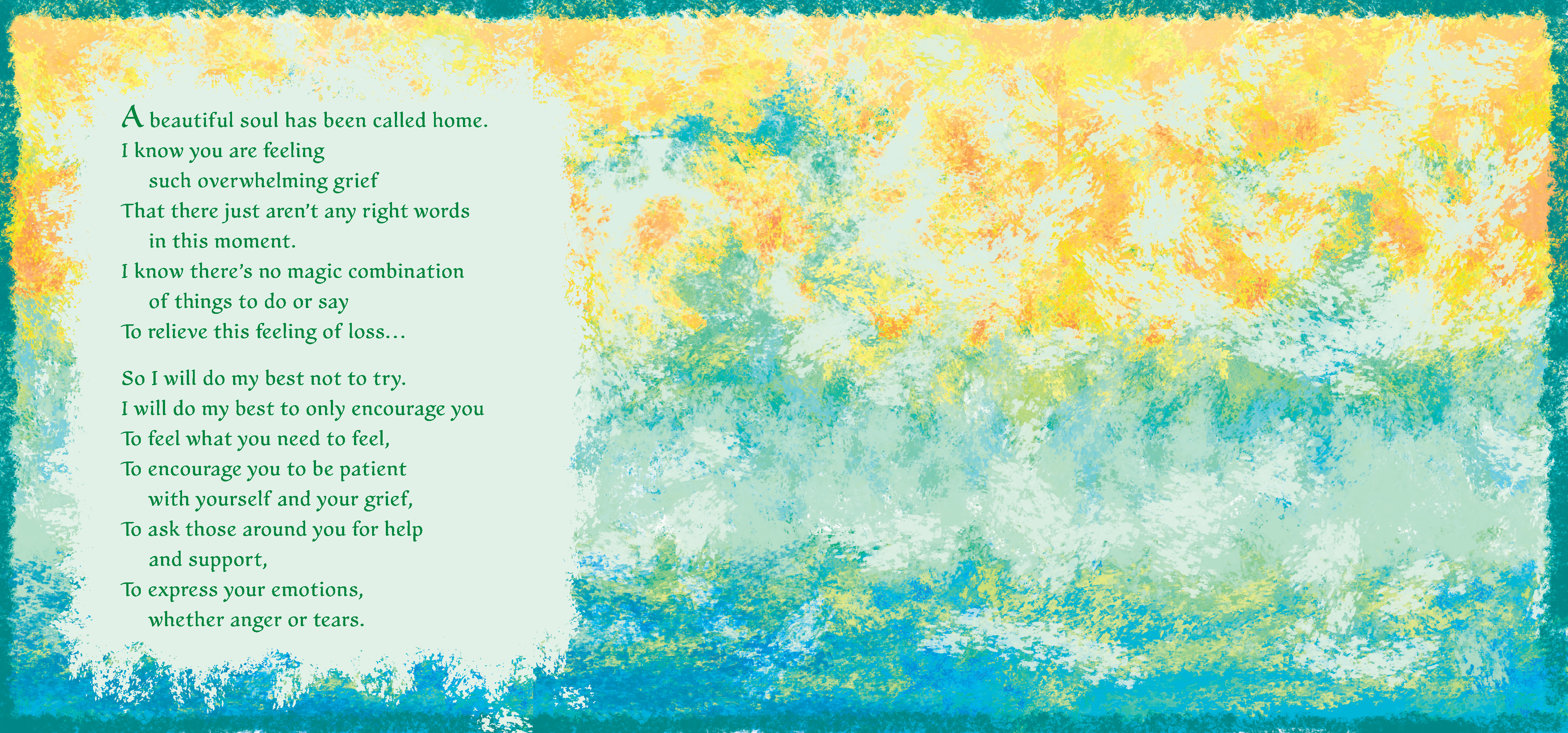 Trifold Card Size: 5 x7 inches Inside: A beautiful soul has been called home. I know you are feeling such overwhelming grief that there just aren’t any words in this moment…..
