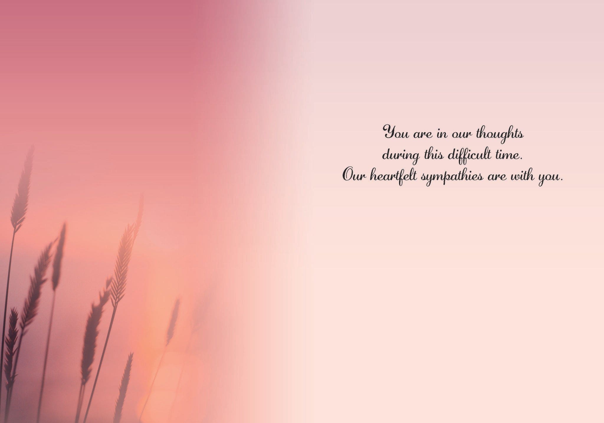 Each card measures 5″x7″ (13cmx18cm) and is printed in full colour on linen paper, comes with a coordinating colour envelope. Printed in Canada. INSIDE: You are in our thoughts during this difficult time. Our heartfelt sympathies are with you.