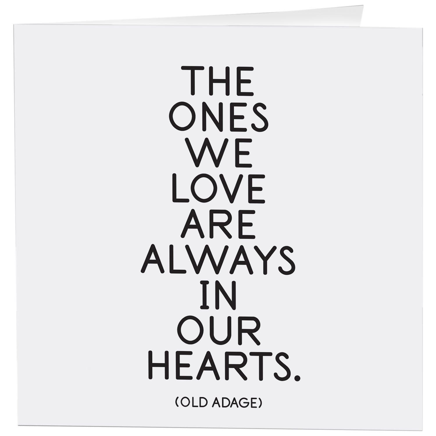 5″ square greeting card. Printed in the USA on recycled paper. Inside: the ones we love are always in our hearts.