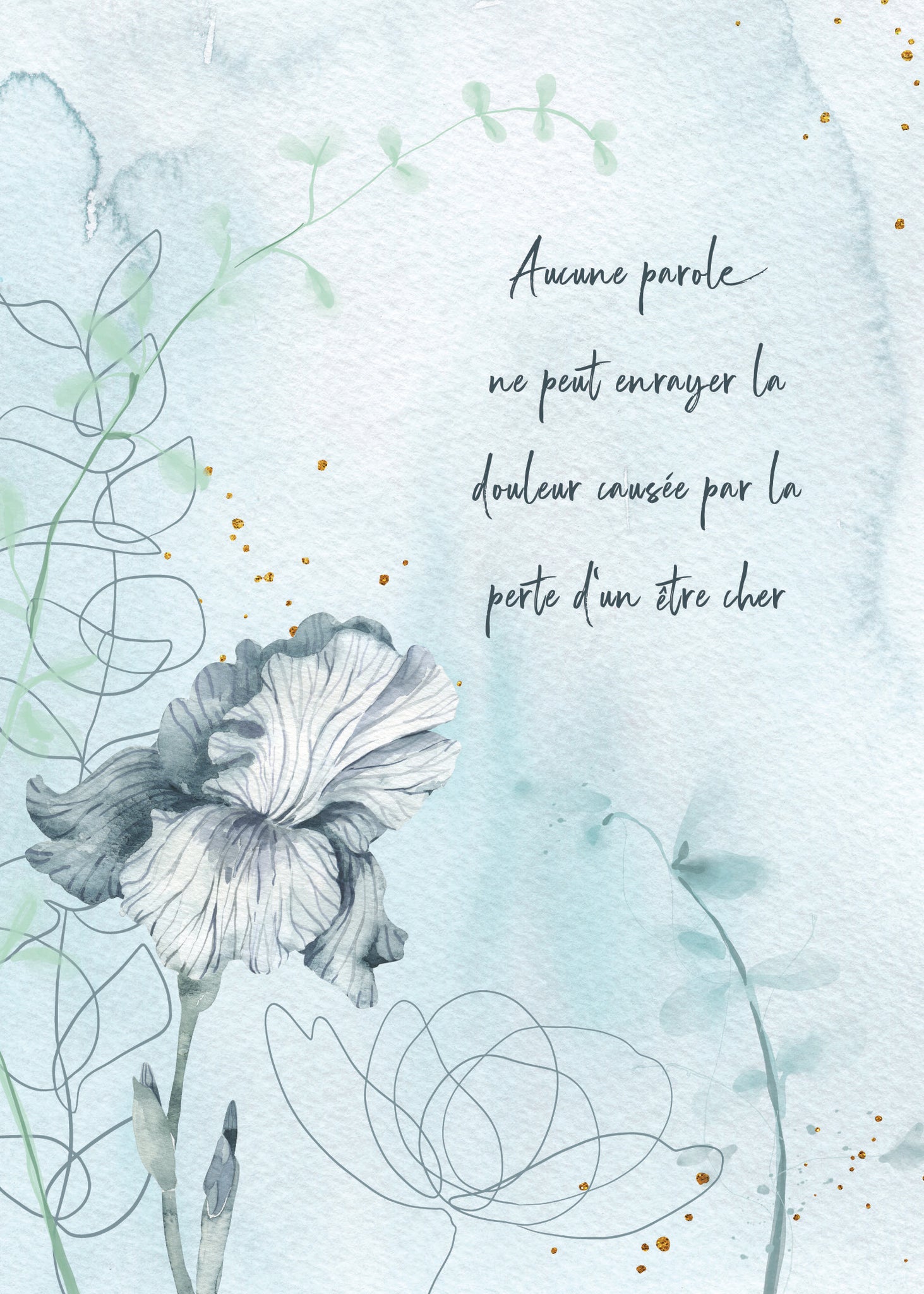 Carte 5″ x 7″ imprimée sur du papier lin couleur. À l’intérieur: Je suis de tout cœur avec toi et ta famille en cette période difficile. Imprimé au Canada.