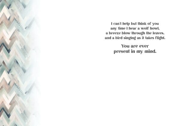 5×7″ printed in full col. on linen paper with a coordinat. envelope. Printed in CAN. Inside: I can’t help but think of you any time I hear a wolf howl, a breeze blow through leaves, a bird singing as it takes flight. You are ever present in my mind.