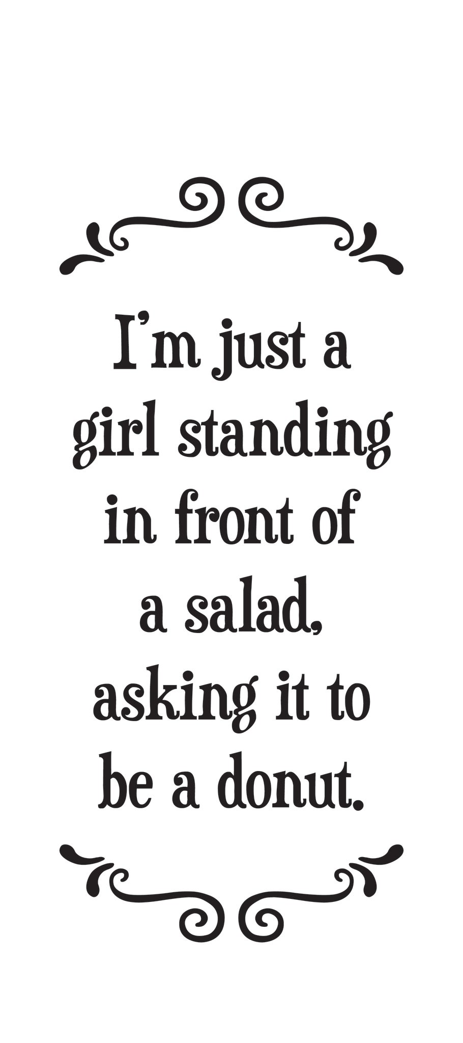 27″ x 18″ 100% Cotton flour sack towel with black and white text: I’m just a girl standing in front of a salad, asking it to be a donut.