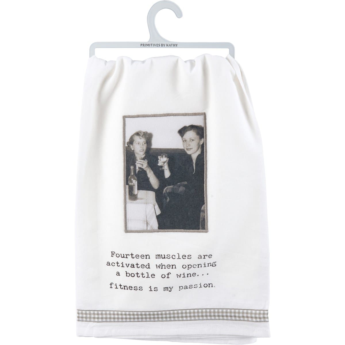 Humorous black and white cotton kitchen towel featuring a panel stitched accent, vintage photography and gingham ribbon trim. Towel measures 28″ x 28″. Machine-washable.