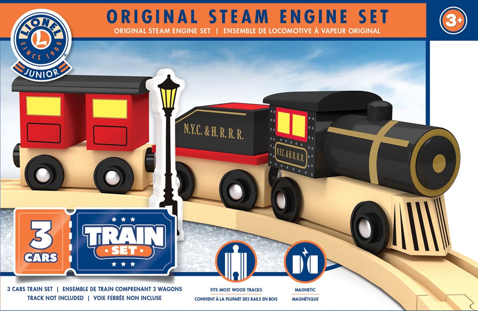 Lionel Jr. Steam Engine Set 3-car wooden toy train includes a steam engine, tender, tunnel locomotive, and a vintage lamppost! This magnetic train set is compatible with most 1″ wooden train tracks, including Brio. (Tracks not inc) For ages 3 and up!
