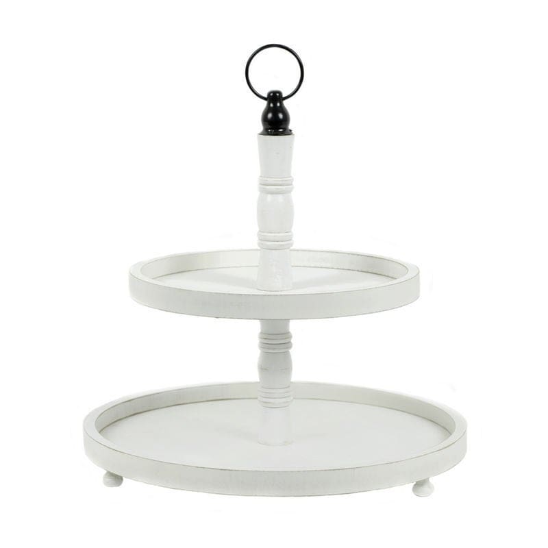 15.5″x 18″x 15.5″ Two Tiered Wood Tray, White. This top selling white tray is perfect for any tabletop decor. Organize and display all of your seasonal or everyday decor and switch it out with ease. Assembly required