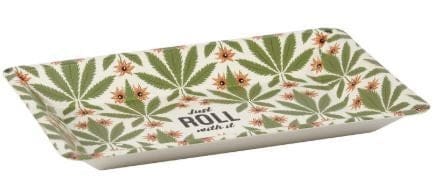 Durable 6.75″ x 4.25″ metal vanity tray displays a relaxing pot leaf pattern accented with a chill sentiment that reads “Just Roll With It” all in an earthy color palette.