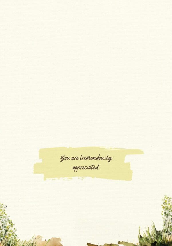 Each card measures 5″x7″ (13cmx18cm) and is printed in full colour on watercolour paper, comes with a coordinating colour envelope. Printed in Canada. Inside greeting: You are tremendously appreciated.