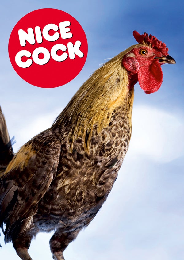 This greeting card measures 5″ x 7″ INSIDE: Can that cock make me crow!? Happy Valentine’s Day. Printed in Canada