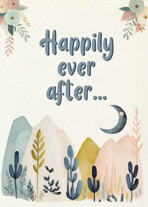 Each card measures 5″x7″ (13cmx18cm) and is printed in full colour on linen paper, comes with a coordinating colour envelope. Printed in Canada. Inside greeting: the best love stories never end. Congratulations