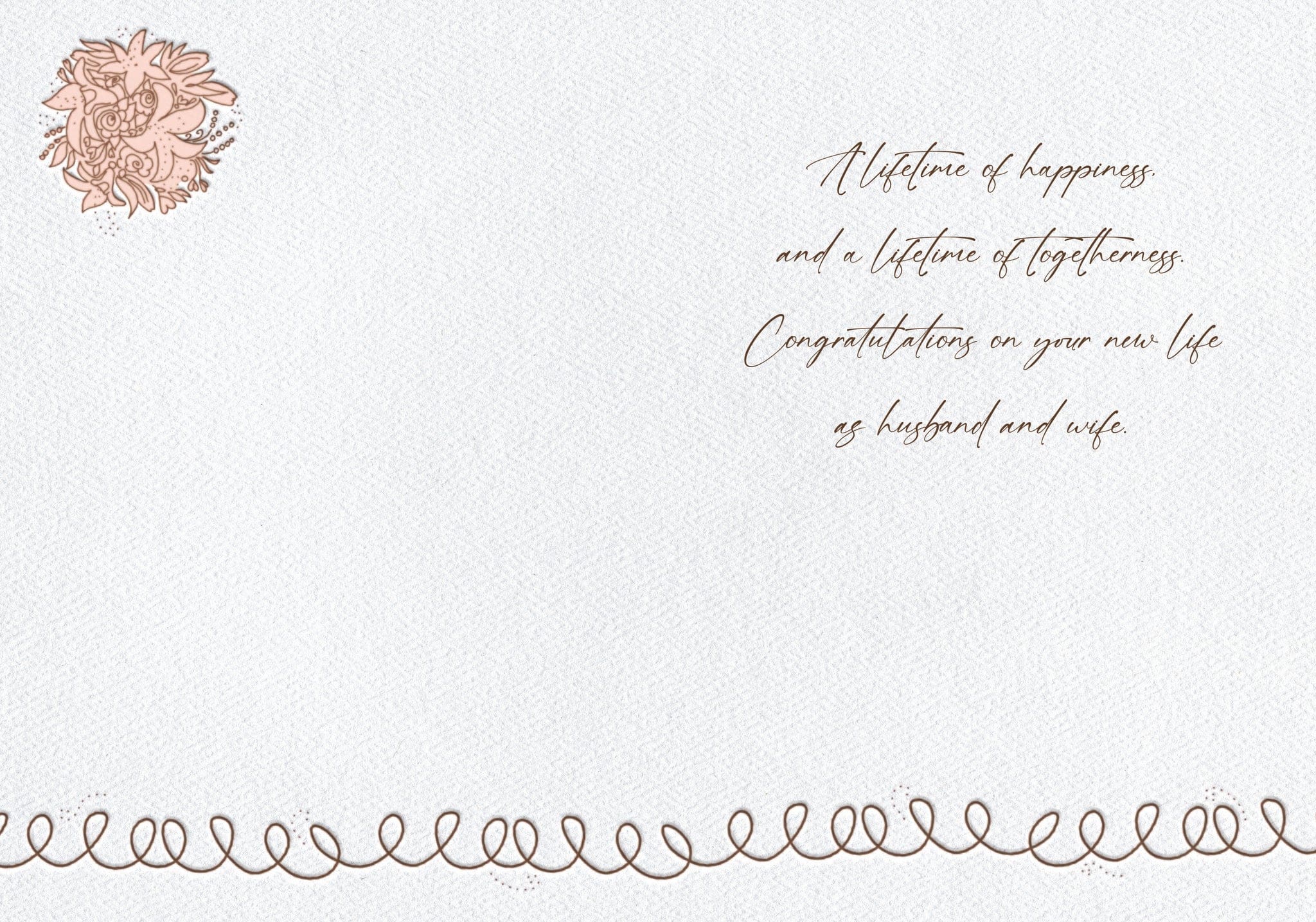 Measures 5″x7″ (13cmx18cm) is printed in full colour on linen paper, and comes with a coordinating colour env. Printed in Canada. Inside: A lifetime of happiness, and a lifetime of togetherness. Congratulations on your new life as husband and wife.