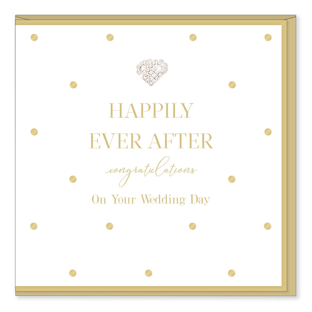 Mad Dots Cards. This 15cm x 15cm greeting card is printed on cardstock, features gold foil details and is embellished with a diamante jewel. Cellophane wrapped with a pearlescent gold envelope. Made in England. INSIDE: Blank